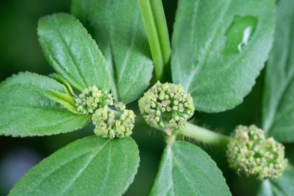 5、杯状聚伞花序密集呈头状,腋生。蒴果卵状三棱形。无臭,味淡微涩。