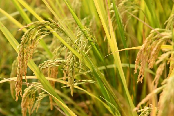 2、穗层有落差,穗大粒重,结实率高,谷色黄亮,偶有短芒,谷粒中长形,稃尖紫色。